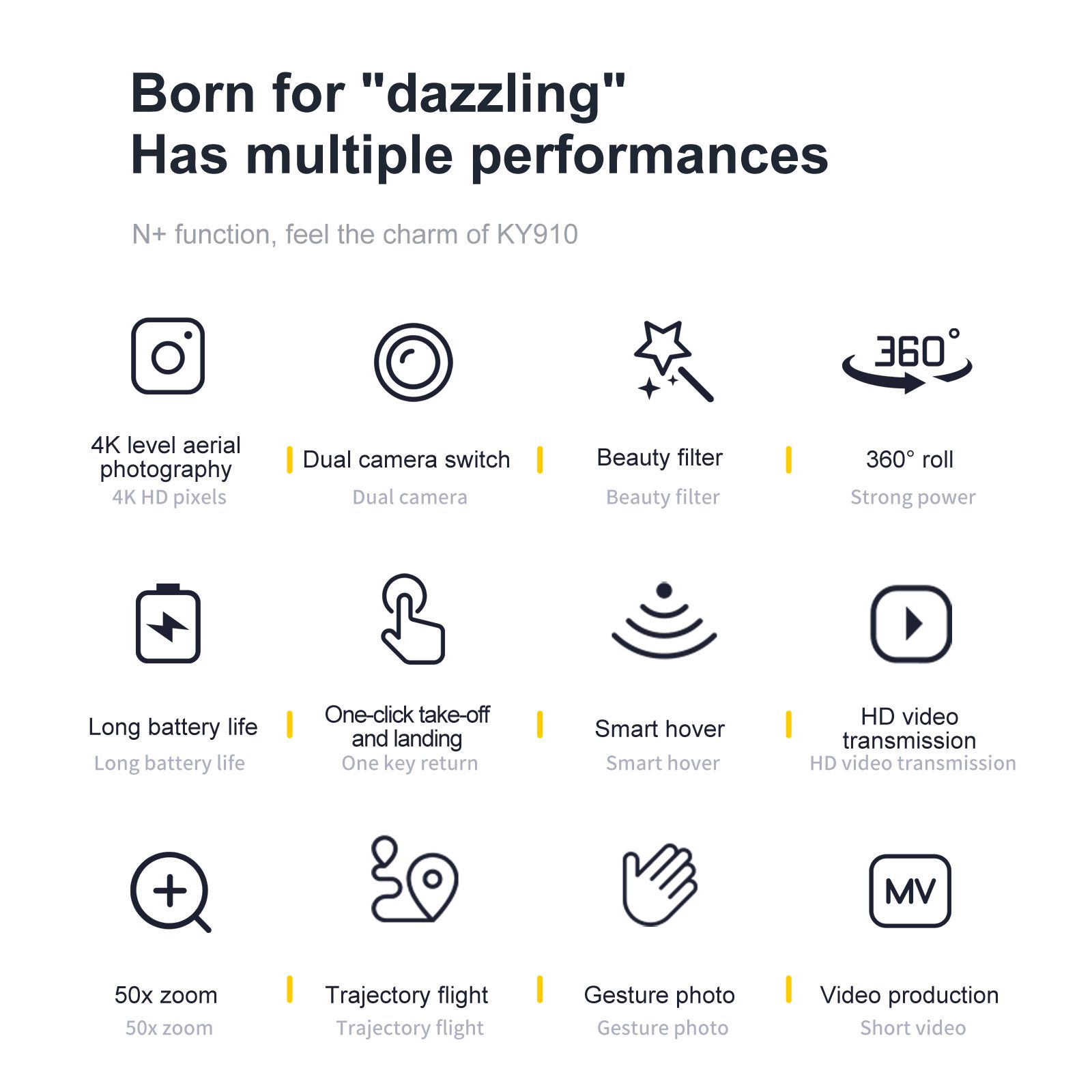 Il KY910 è un mini drone compatto e facile da usare, progettato per i principianti e il volo indoor. La sua caratteristica principale è il posizionamento visivo a flusso ottico, che utilizza lenti ad alta definizione sia anteriori che inferiori per consentire un volo stabile e un mantenimento preciso dell'altitudine. La fotocamera frontale offre una regolazione manuale di 15°, consentendo un'inquadratura flessibile da diverse angolazioni. Questo sistema intuitivo rende il funzionamento estremamente semplice, favorendo la sicurezza dei nuovi piloti. Con la sua enfasi sulla stabilità, la facilità d'uso e la portabilità, il KY910 è un eccellente drone introduttivo e un regalo perfetto per gli aspiranti appassionati di aviazione.