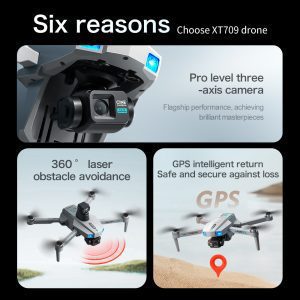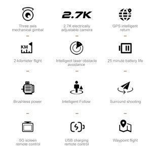 Drone GPS professionale, distanza di volo di 3 chilometri,Stabilizzazione elettronica EIS a tre assi, puntamento GPS, schermo di controllo remoto HD da 4,5 pollici, trasmissione immagini in tempo reale 5G, tracciamento GPS surround, posizionamento GPS, posizionamento ottico, doppia modalità GPS+flusso ottico, ritorno con un solo clic GPS, ritorno intelligente GPS (ritorno a distanza, ritorno batteria scarica, ritorno fuori controllo), sistema intelligente di prevenzione ostacoli laser, fotocamera 4K ad alta definizione, tracciamento intelligente GPS, volo surround.